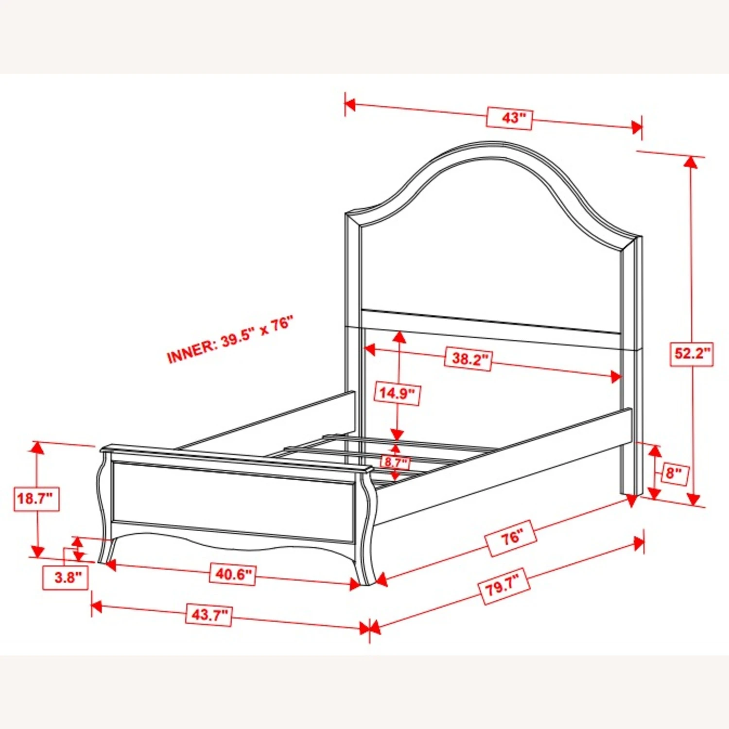 Twin Bed 43.75”w x 79.75”d x 52.25”h (4 slats)