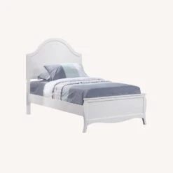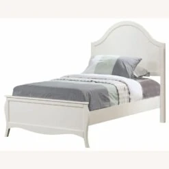 • Charming bed features flared posts, simple curved molding, and an arched headboard