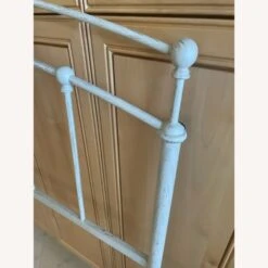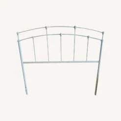 Seller’s Notes: Simple yet stylish distressed white painted metal headboard adds finish to a full bed.