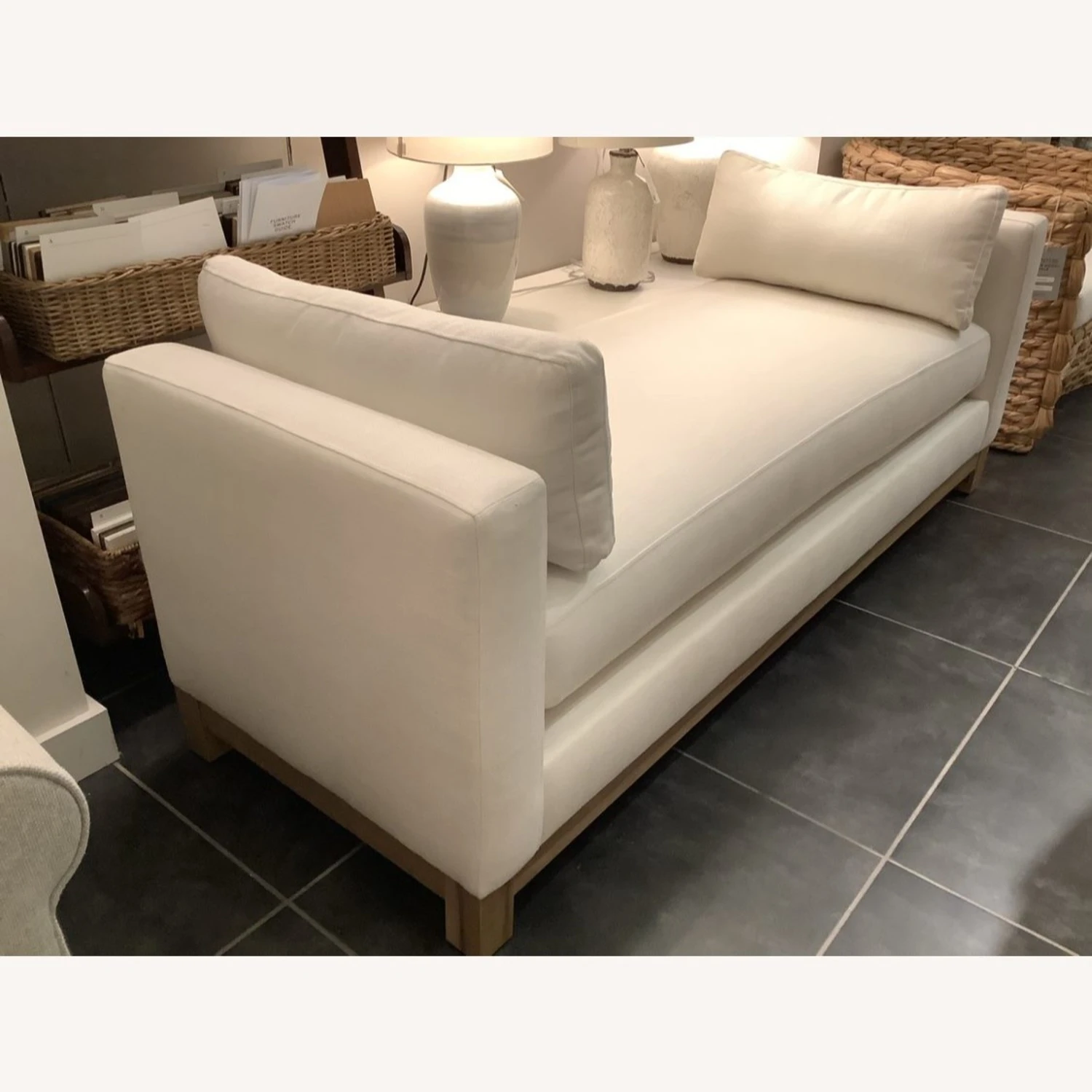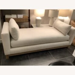 Wear and tear details: Very light stain on top of cushion. One corner of the base of the wooden leg been repaired and has metal brackets to hold it in place.