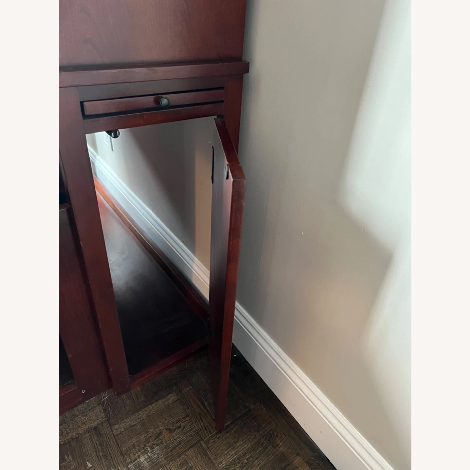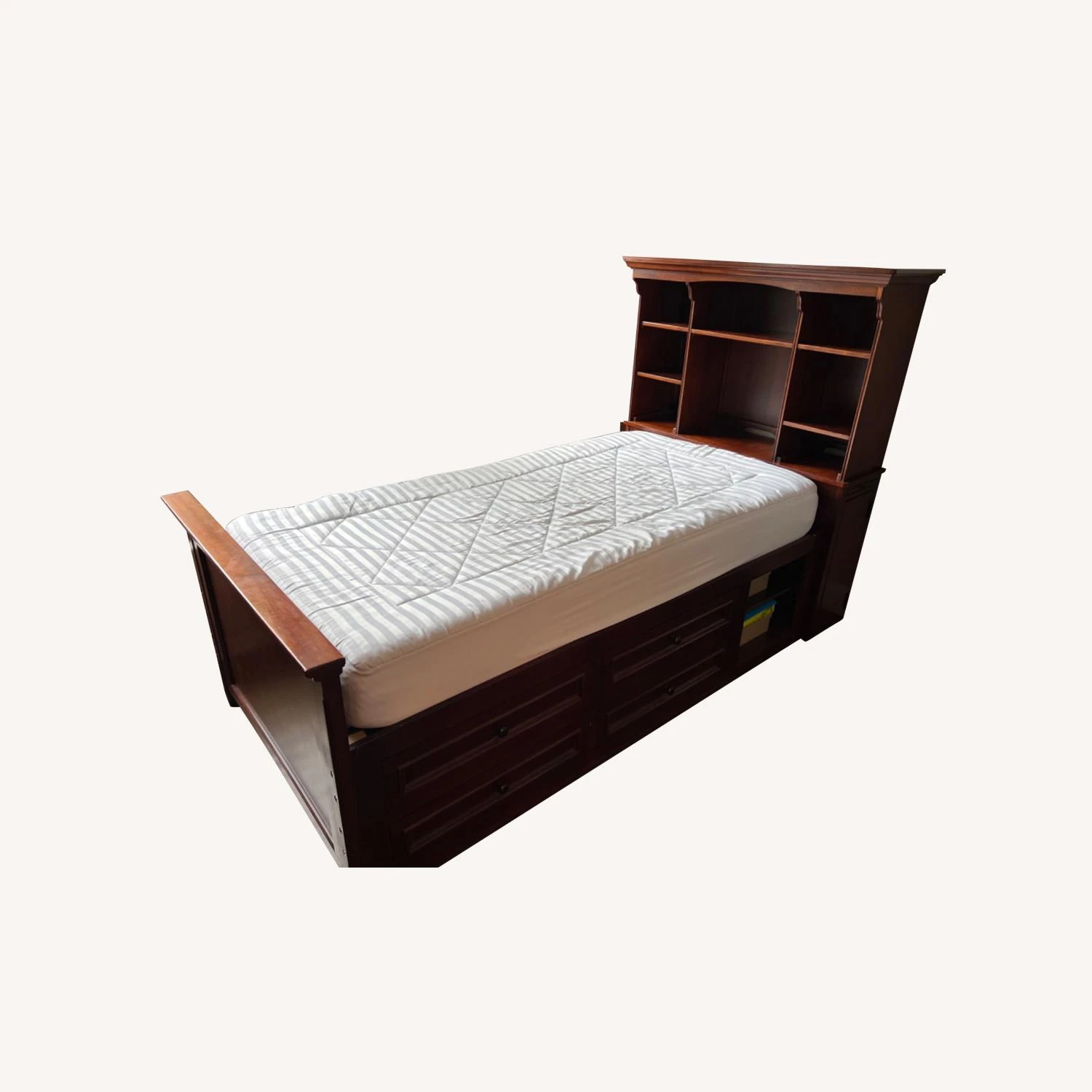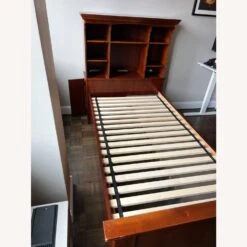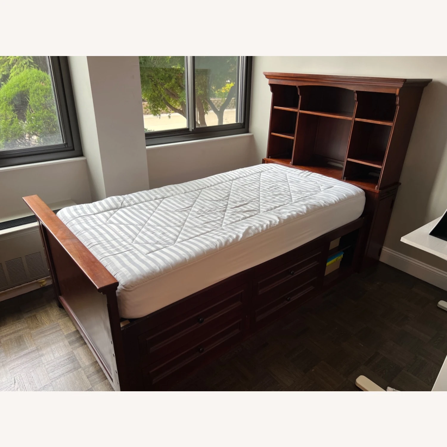 Seller’s Notes: This beautiful hardwood twin bed features 4 large drawers, two lower shelves, a large upper shelves area for books and personal items, and a huge lower storage hatch suitable for bulky items like blankets, tote bags and more. The mattress sits on top of a platform 19” off the floor, for an elegant raised feel. No box spring needed. Two small wood shelves slide out on either side, for extra nightstand-like appeal. This bed belongs to a set with two additional dressers with matching hardware and type of hardwood. The beautiful cherry finish has only minor wear and tear, and comes from a clean, pet-free, smoke-free home.