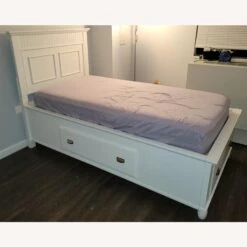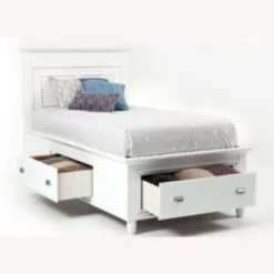 Seller’s Notes: White twin bed with silver hardware and 3 storage drawers.