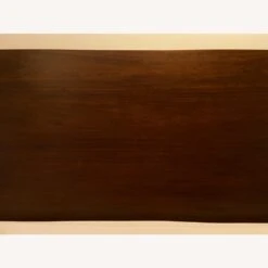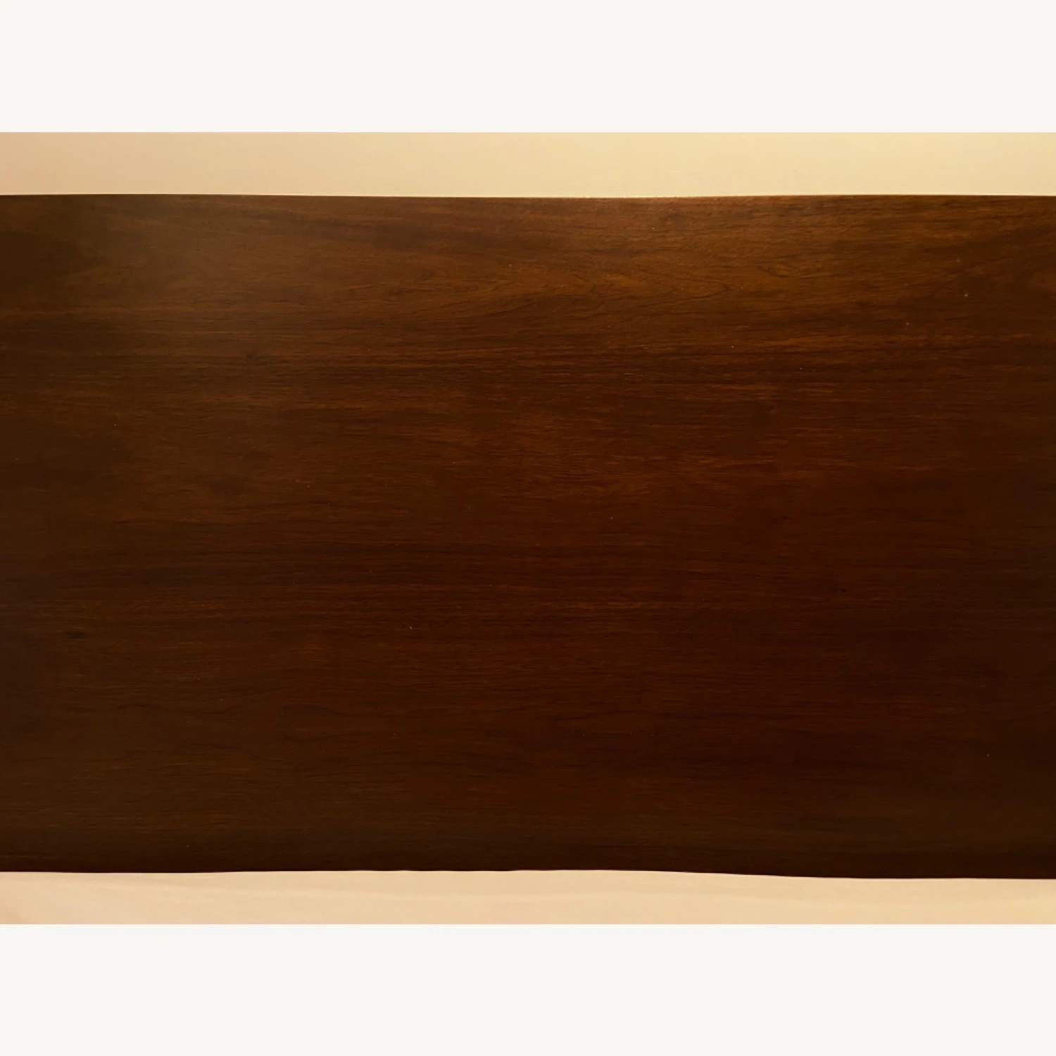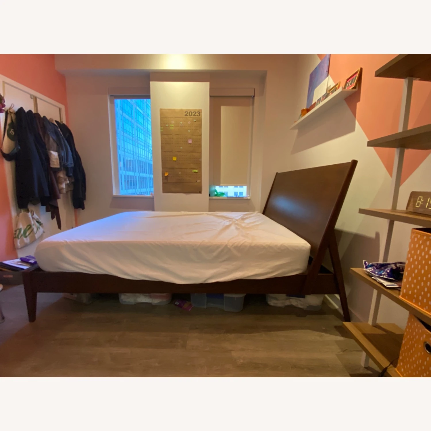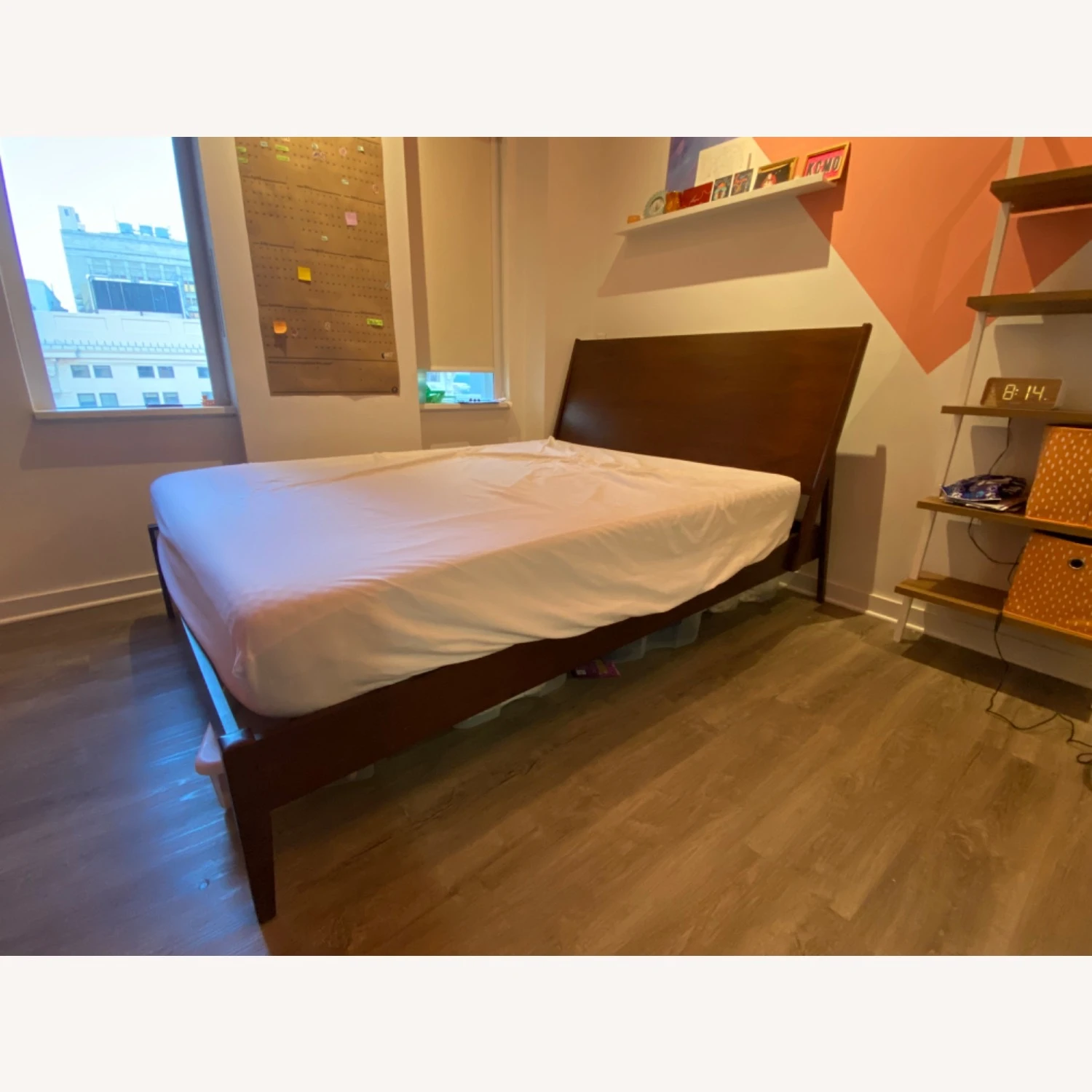 Seller’s Notes: Gorgeous walnut wood queen bed frame with angled headboard. There is space between the headboard and frame perfect for putting a surge protector. Enough clearance beneath the bed to put rolling storage bins. Was in the room while pink paint was being put on the walls so there are microscopic paint drips on the headboard, included in the last picture.