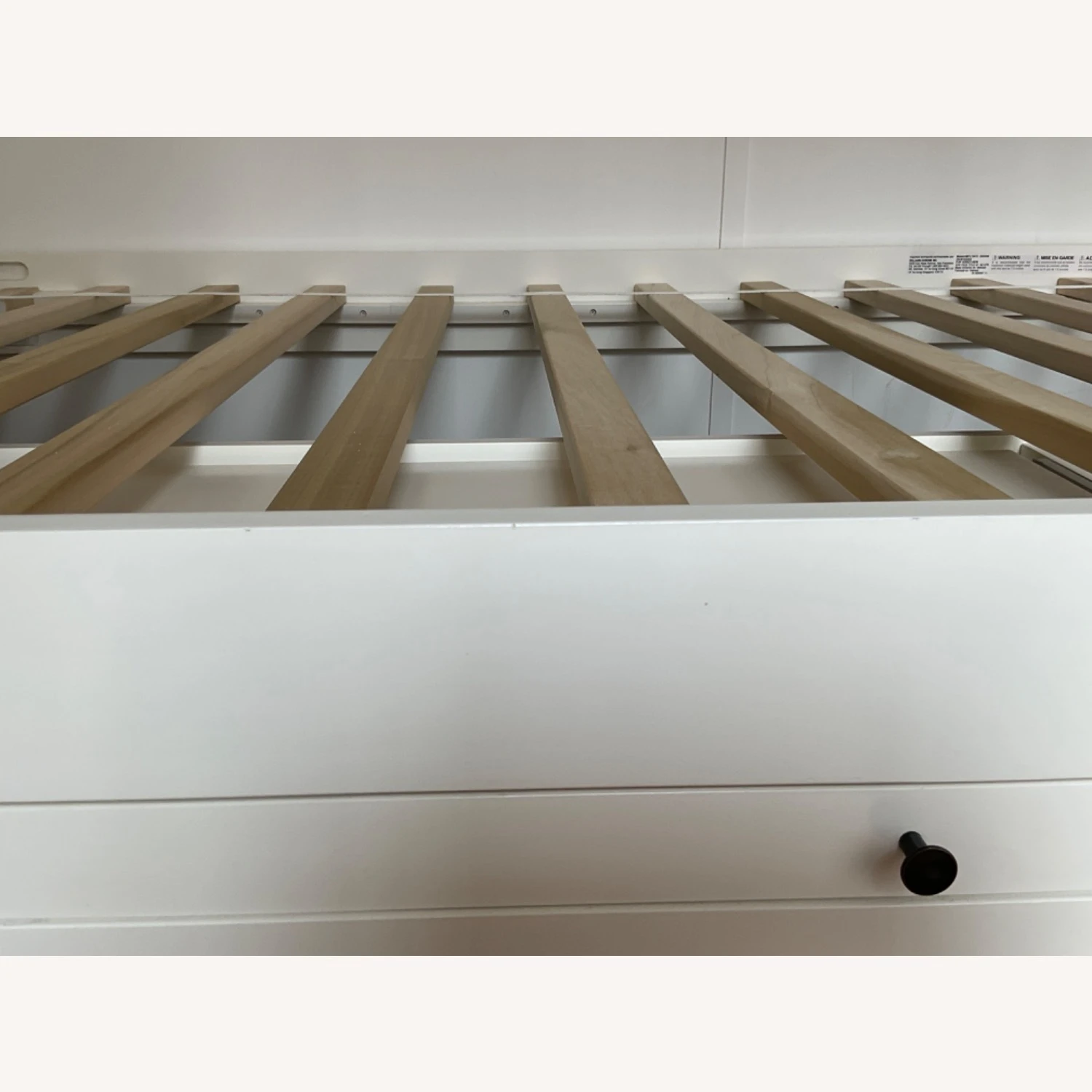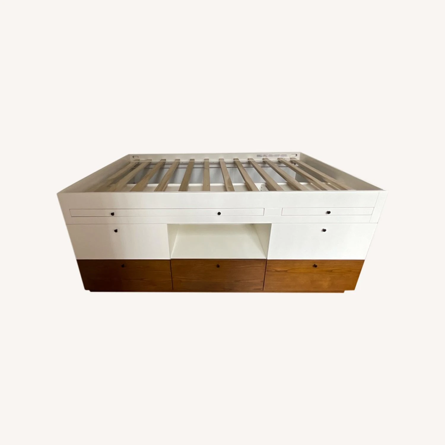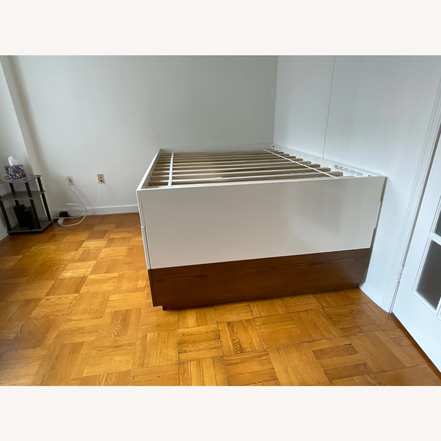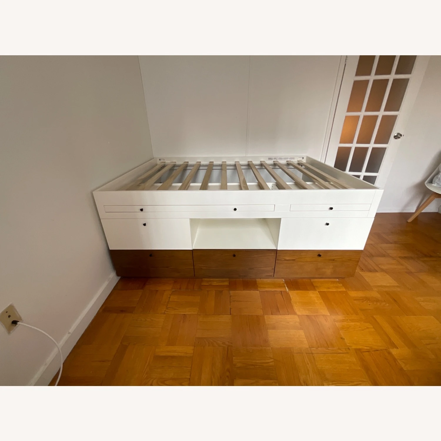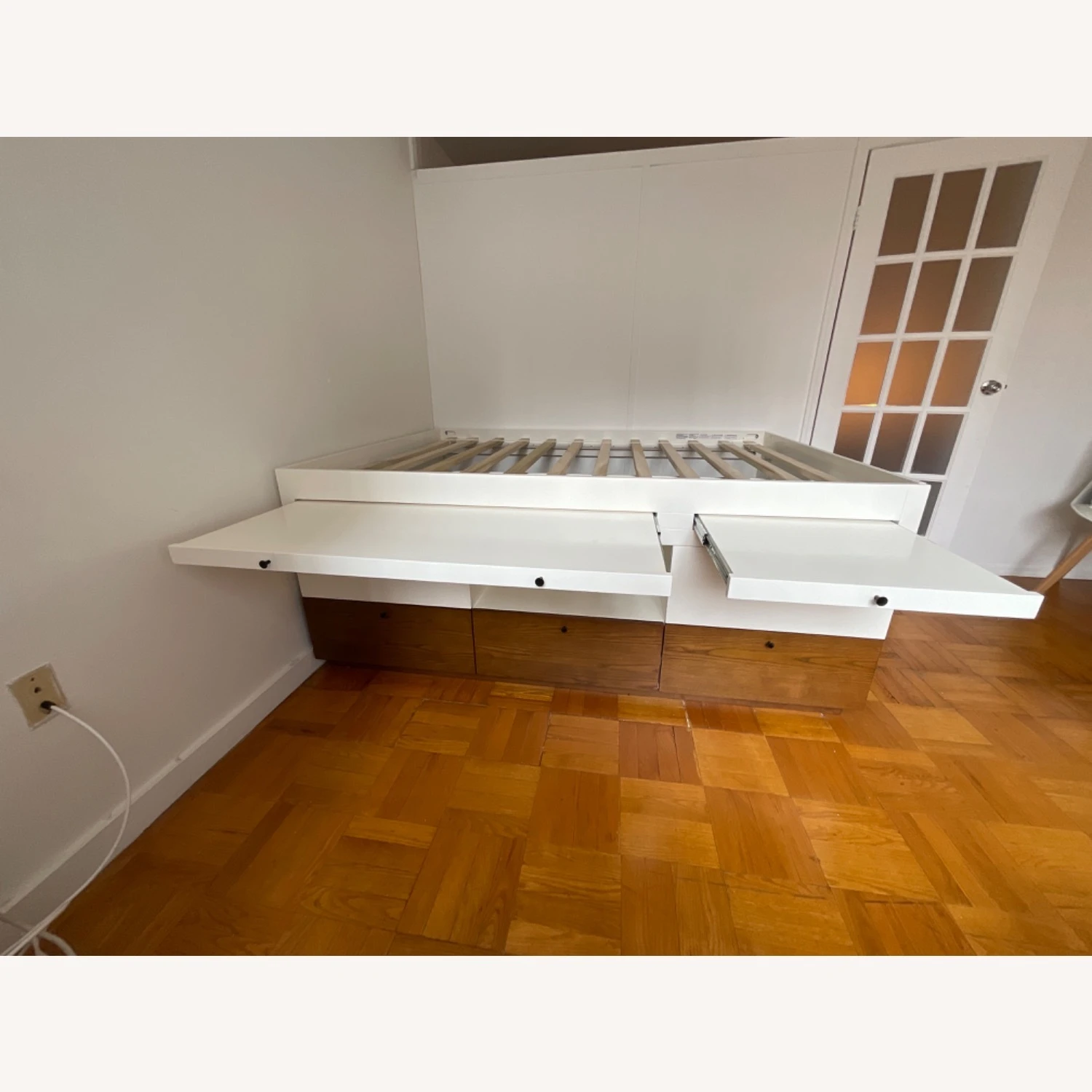 Seller’s Notes: Full size bed frame purchased directly from West Elm in 2020. The frame has a pull out side table and desk, as well as a shelf and 5 large drawers. It is a perfect bed frame for small nyc bedrooms and has been an excellent space saver for 3 years. Drawers fit my full wardrobe with space behind for storage.