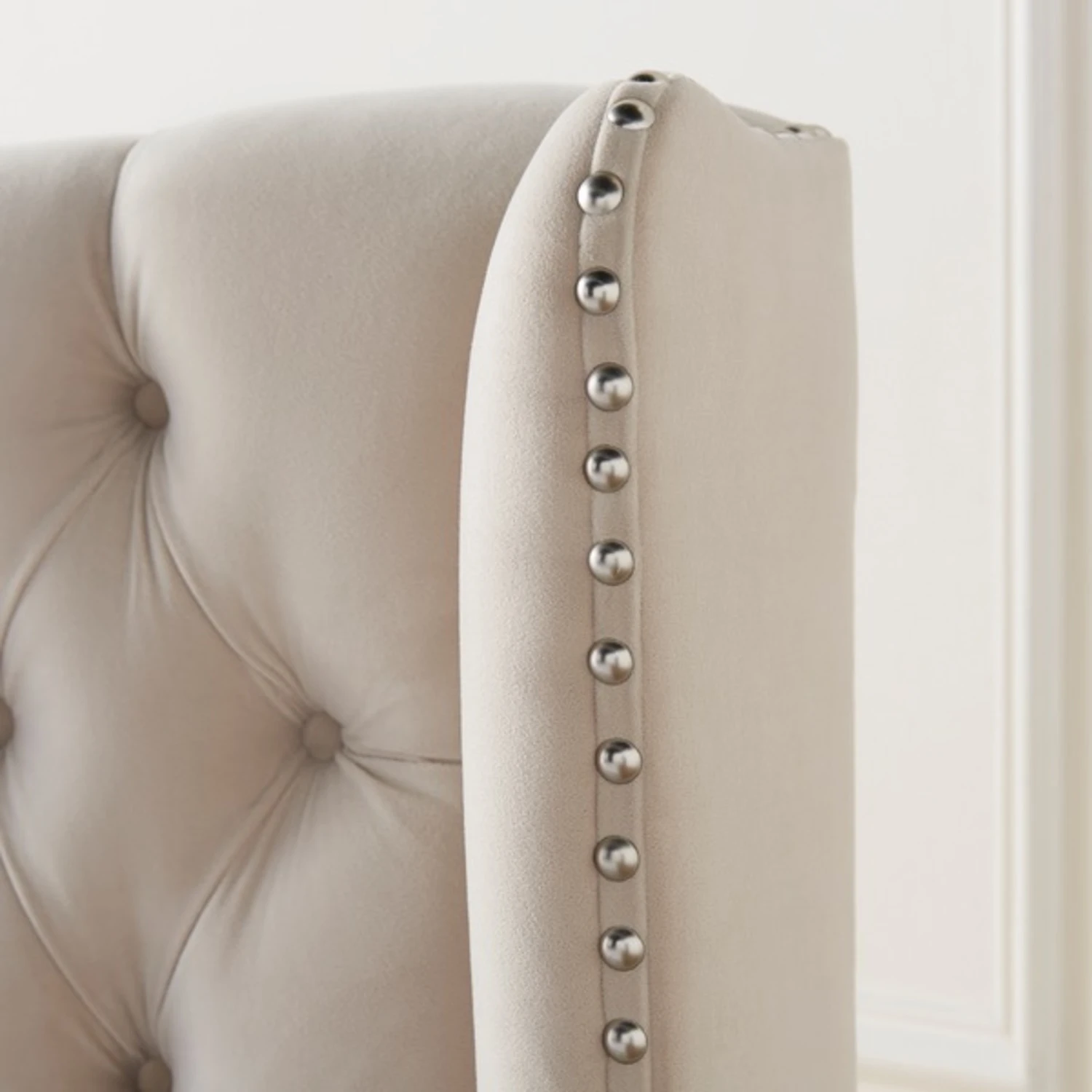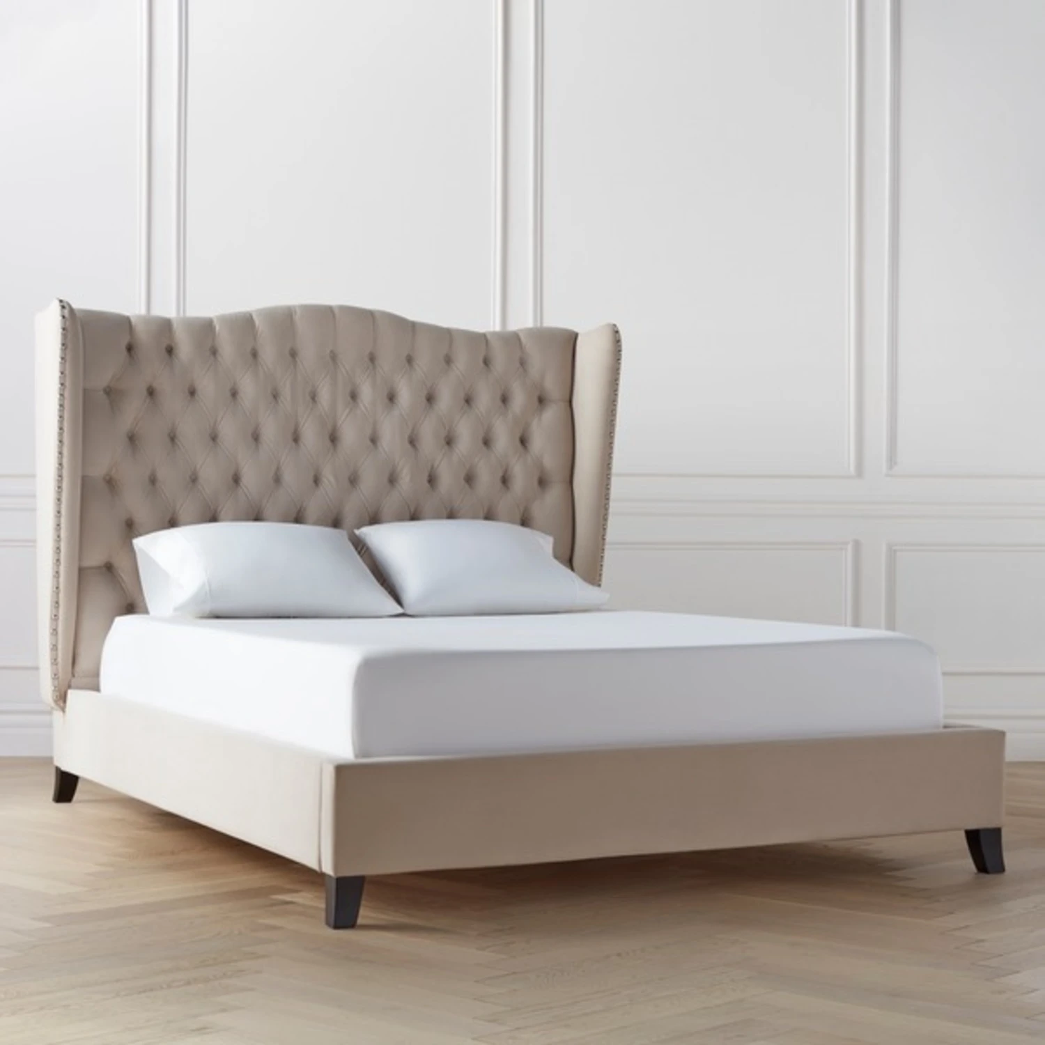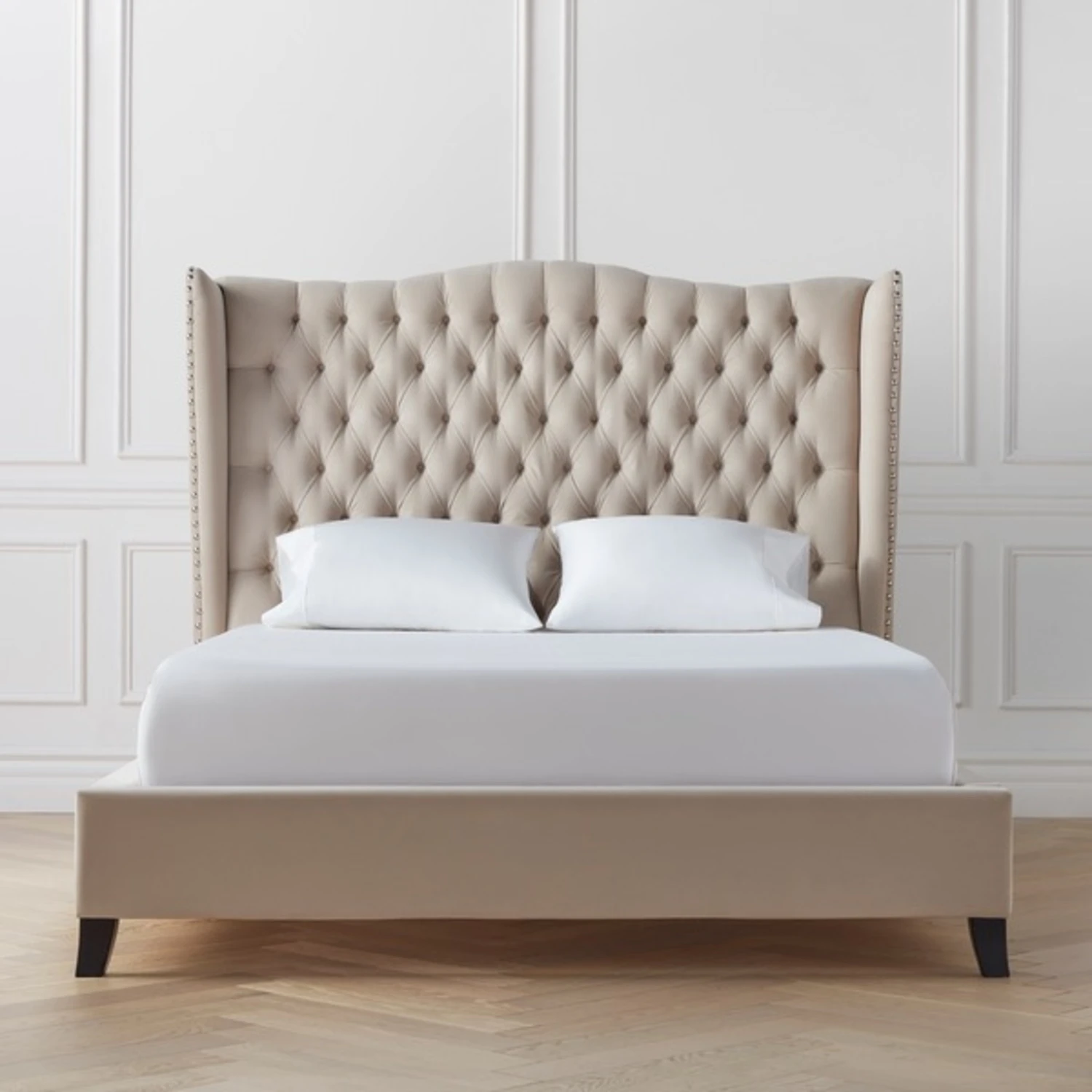 With its graceful camelback silhouette, deep, hand-applied button tufts, and plush padding, you’ll rest luxuriously in our Jameson Bed. Trimmed with decorative nailheads, its winged sides and considerable height add a sense of opulence and drama to the bedroom. Shown in Bella Velvet Pearl with brushed silver nailheads.
